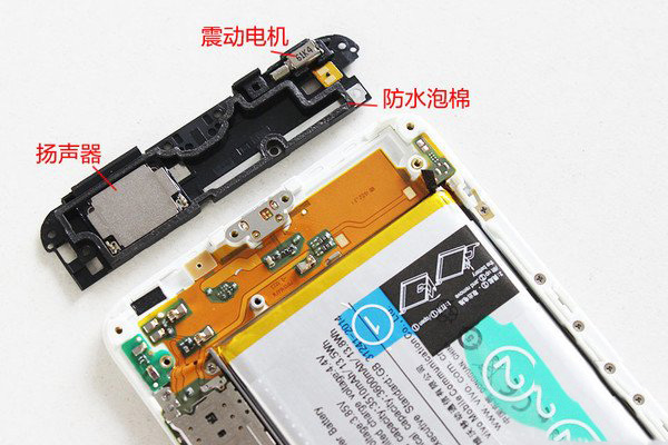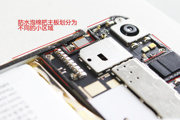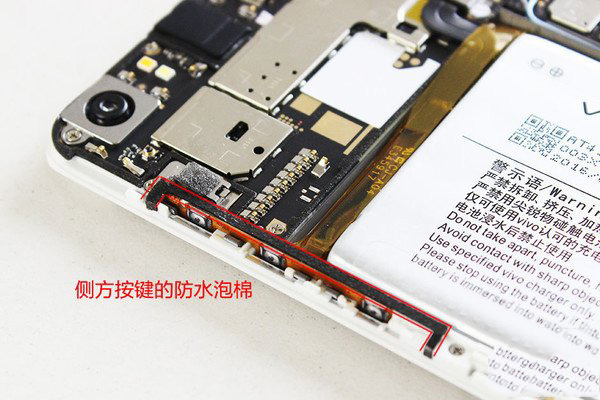 在vivo手機上常見的防水泡棉設計,這種設計能防止水分從側(cè)方按鍵滲入到內(nèi)部,有效保護主板。