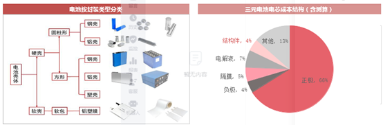 方形和圓柱電池使用電池結(jié)構(gòu)件,軟包電池使用鋁塑膜;當前方形和圓柱是主流的封裝路線