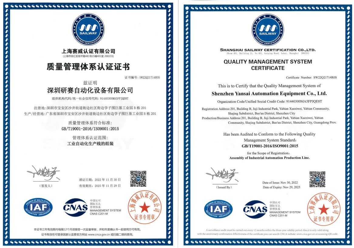 ISO-9001標(biāo)準(zhǔn)是全球通用的關(guān)于質(zhì)量管理和質(zhì)量保證的系列標(biāo)準(zhǔn),目前已被90多個(gè)國(guó)家等同或等效采用,是迄今為止世界上最成熟的質(zhì)量框架。本次ISO 9001質(zhì)量管理體系認(rèn)證的通過(guò),一方面肯定了深圳市研賽自動(dòng)化設(shè)備有限公司自身的實(shí)力,同時(shí)也是對(duì)公司未來(lái)成長(zhǎng)壯大的一種鞭策。獲得質(zhì)量體系認(rèn)證,標(biāo)志著深圳市研賽自動(dòng)化設(shè)備有限公司質(zhì)量管理水平和管理理念的不斷提升,是企業(yè)在發(fā)展過(guò)程中的一個(gè)新的里程碑,為企業(yè)向社會(huì)提供優(yōu)質(zhì)的產(chǎn)品和服務(wù)提供了強(qiáng)有力的保障。