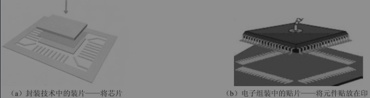 。由于在封裝技術(shù)中,芯片外形和拾取性能相對(duì)變化不大,就裝片工序相對(duì)于其他復(fù)雜而精確度要求很高的工序來(lái)說(shuō)并不是技術(shù)關(guān)鍵,而且裝片通常是和鍵合機(jī)組合為一種設(shè)備,因而在封裝技術(shù)中,貼裝的重要性遠(yuǎn)不如組裝技術(shù)。但是這兩種貼裝技術(shù)、工藝要求和設(shè)備原理實(shí)質(zhì)上是一樣的,只不過(guò)封裝技術(shù)中的裝片從設(shè)備精確度到工藝要求都要比組裝技術(shù)高。近年來(lái),隨著高密度高精度組裝技術(shù)的發(fā)展,封裝技術(shù)和組裝技術(shù)界線開始模糊,組裝技術(shù)開始與封裝技術(shù)交叉融合,封裝級(jí)精確度的貼片機(jī)開始應(yīng)用于組裝技術(shù)?!把b片”與“貼片”如下圖所示。