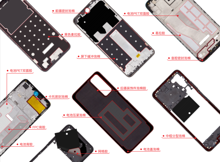 在智能手機粘接應用中,常用的粘膠帶有OCA光學膠,易拉膠,防爆膜/AB膠,亞克力雙面膠,導熱膠帶,防波紋泡棉,PET雙面膠,保護膜等膠帶,每種膠帶的應用方向也不一樣。