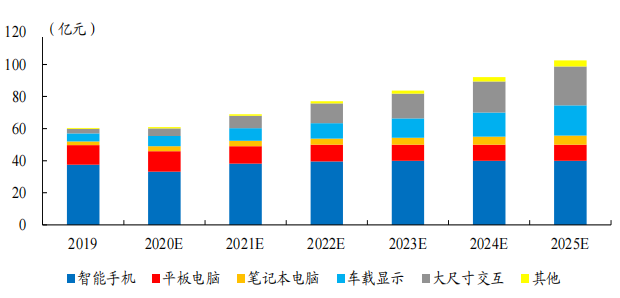 以智能手機為代表的消費電子產業(yè)快速發(fā)展,帶來OCA光學膠大規(guī)模商業(yè)化應用。尤其在大尺寸多屏發(fā)展趨勢的車載顯示領域、8K超清晰大尺寸交互屏幕領域,OCA光學膠的用量將水漲船高,滲透率大幅提升。根據IDC統(tǒng)計,預計2025年OCA終端市場規(guī)模超100億元。
