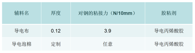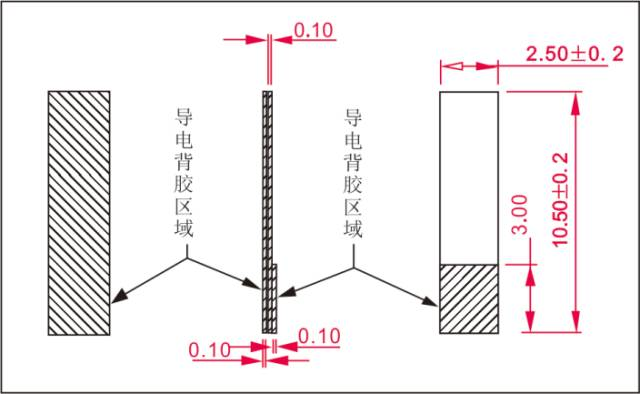 導電布所制背膠為導電背膠,長度因結構限制定制,寬度配合位間隙單邊預留0.1mm。