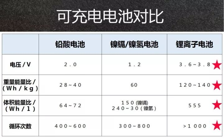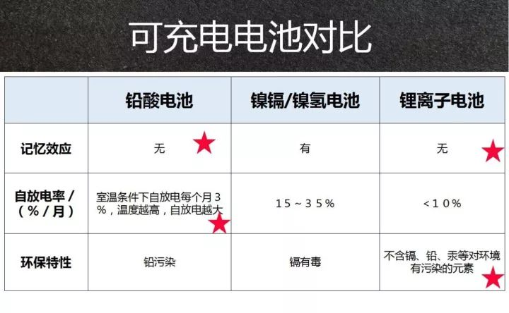 可充電電池常見的有三種:鉛酸電池、鎳鎘鎳氫電池、鋰離子電池。對比這三種電池,首先看電壓,明顯,鋰電池的電壓大于另外兩種,尤其在電動車、電動工具等需要高電壓的電池產(chǎn)品上,鋰電池就占優(yōu)了,起碼串并聯(lián)的電池不需要那么多。重量能量比就理解為單位重量的電池誰更高,明顯鋰離子電池要比其他兩種高出幾倍,同體積情況下,鋰離子電池也高出將近十倍。放凈電到充滿電算是一個循環(huán),鋰離子電池可以1000次以上也比其他電池高出兩倍。而且鋰離子電池沒有記憶效應(yīng)。鎳鎘電池卻有。記憶效應(yīng)指的是如果放電不放干凈,電池將會記住放電的量,等進(jìn)行充電時候,電池也不會充滿。這是一大缺點(diǎn)。自放電率鎳鎘電池更差,每月都會放出三分之一。從環(huán)保特性來看,鋰離子電池不含有對環(huán)境有污染的鉛、汞、鎘等金屬,而鉛酸電池、鎳鎘電池都有污染。