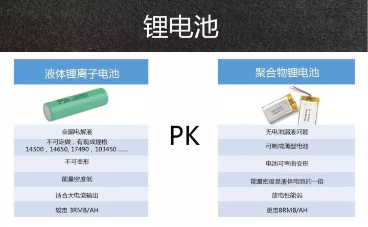 鋰電池通常包括:金屬鋰電池(常見如紐扣鋰電池)和鋰離子電池(也就是大家通常所說的鋰電池),金屬鋰電池是分解金屬形態(tài)的鋰,而且不可還原,所以他不是可充電電池,我們也不介紹他了。鋰離子電池包括液態(tài)鋰離子電池和聚合物鋰離子電池,液態(tài)鋰離子電池就是我們常見的18650那樣的電池,里面是液體的電解質(zhì)。而聚合物鋰電池是的電解質(zhì)是固體或者膠體形態(tài)。