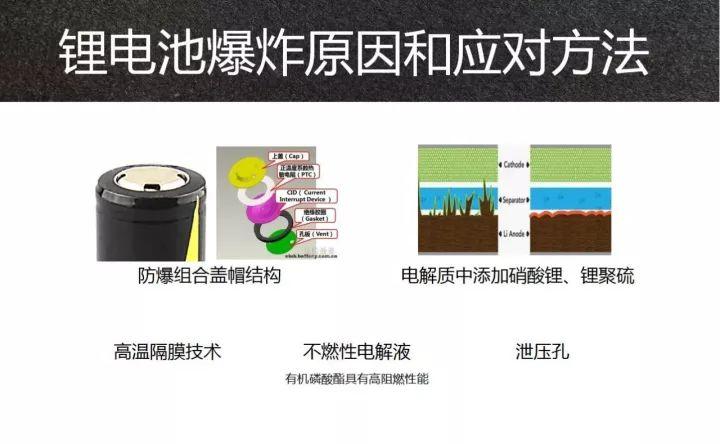 電池內(nèi)會加上一種擁有眾多細(xì)孔的隔膜紙,來防止短路。好的隔膜紙當(dāng)電池內(nèi)部溫度高到135 攝氏度時還可以在電池溫度過高時,自動關(guān)閉細(xì)孔,讓鋰離子無法穿越,反應(yīng)終止或近乎終止,電流驟降,溫度也慢慢下降,進(jìn)而避免了爆炸發(fā)生。但是,細(xì)孔關(guān)閉率太差,或是細(xì)孔根本不會關(guān)閉的隔膜紙,會讓電池溫度繼續(xù)升高,更多的電解液汽化,最后將電池外殼撐破,甚至將電池溫度提高到使 料燃燒并爆炸。
