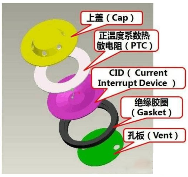 由上蓋帽、PTC過流保護(hù)片、防爆半球面鋁膜、下底板組成的組合件。下底板與電池正極耳焊接連接,是正極片與外部連接的過渡,與防爆半球面鋁膜點(diǎn)焊連接。防爆半球面鋁膜有兩大功能,一是當(dāng)電池內(nèi)壓增大到一定值后,向內(nèi)凹曲面受力后變成向外凸出,使防爆半球面鋁膜與極耳的焊接點(diǎn)拉裂斷開,電池與外界形成開路,電池蓋帽的過充保護(hù)功能開始作用;二是電池內(nèi)壓增大超過防爆鋁膜刻痕處受力極限時,防爆鋁膜破裂,電池開啟,電池內(nèi)壓力從破裂處泄出。