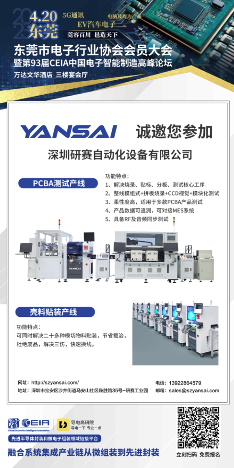 CEIA電子智造邀請(qǐng)業(yè)內(nèi)經(jīng)驗(yàn)豐富的一線工程師、工藝專家、資深學(xué)者等研究人員組成智囊團(tuán),共同分享中國(guó)電子智造智慧,用“使命”凝聚權(quán)威人物。深圳研賽自動(dòng)化設(shè)備有限公司是一家專注于生產(chǎn)3C設(shè)備:貼標(biāo)機(jī),輔料貼裝產(chǎn)線,復(fù)合板貼裝產(chǎn)線,PCBA測(cè)試產(chǎn)線,光模塊自動(dòng)化組裝線。鋰電池設(shè)備:鋰電PACK組裝線,疊片機(jī),注液機(jī),入殼機(jī),超聲波清洗機(jī),轉(zhuǎn)接焊機(jī)。誠(chéng)摯的邀請(qǐng)各界行業(yè)精英參與此次電子制造高峰論壇會(huì)。
