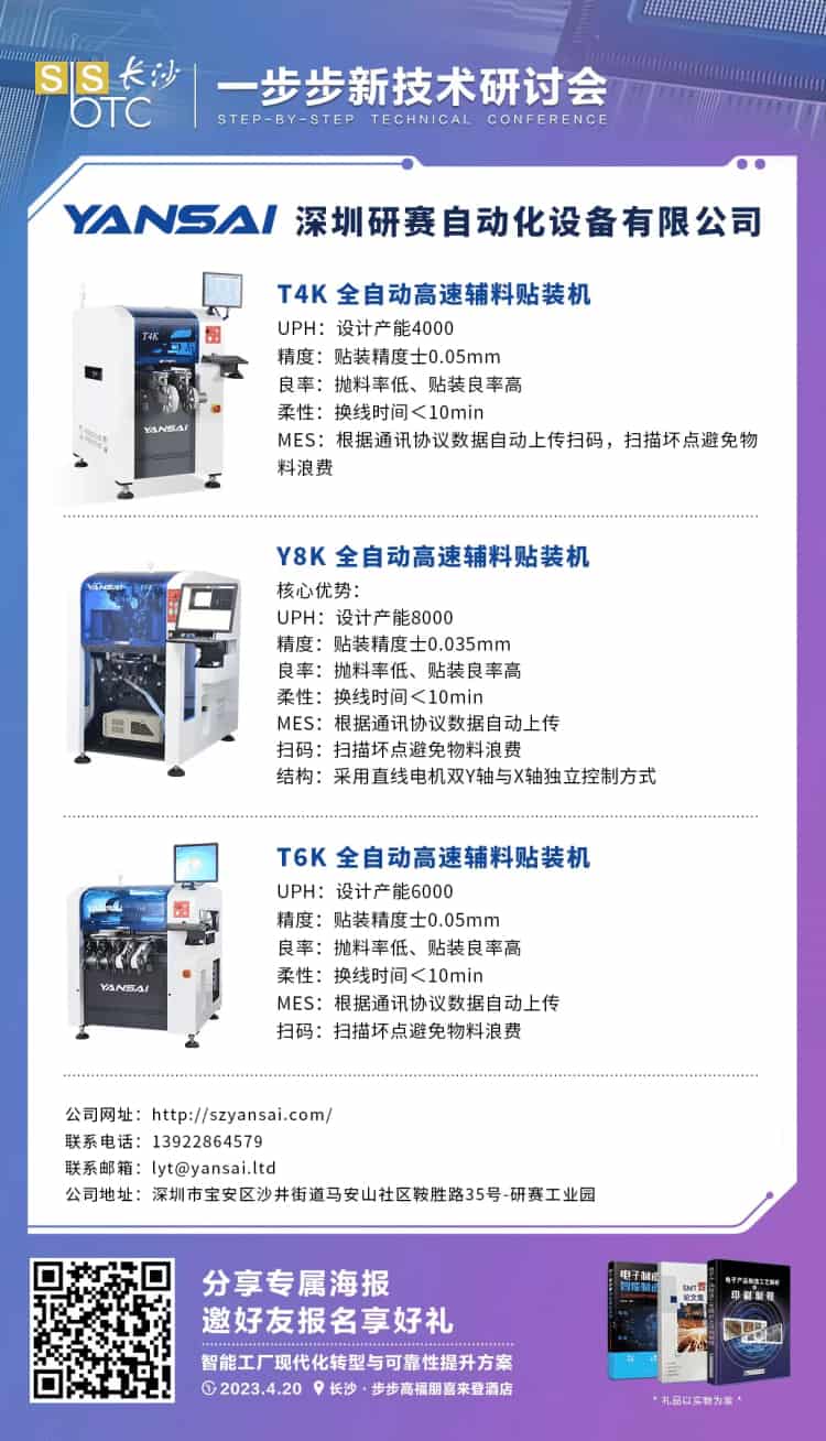 秉承“溝通技術(shù) 賦能未來”的傳播使命,一步步新技術(shù)研討會緊密貼合行業(yè)智能化發(fā)展趨勢,取經(jīng)“長沙路徑”,共同探討電子制造產(chǎn)品可靠性提升方案,感受制造“湘軍”蓬勃生機。深圳研賽自動化設(shè)備有限公司立志成為行業(yè)標桿,率領(lǐng)群體同仁致力于為鋰電和3C行業(yè)提供整體解決方案,涵蓋設(shè)計、制造、銷售和售后等全方位的高新技術(shù)型企業(yè).研賽本著“以研為本,敢賽為先”的創(chuàng)新理念,解決行業(yè)痛點,為客戶創(chuàng)造價值,擁有多項發(fā)明專利及軟件著作權(quán),服務(wù)國內(nèi)眾多上市公司及大型知名企業(yè)!此次長沙研討會研賽推出:全自動高速輔料貼裝機-T4K、全自動高速輔料貼裝機-Y8K、全自動高速輔料貼裝機-T6K等新型高精密度設(shè)備出席。