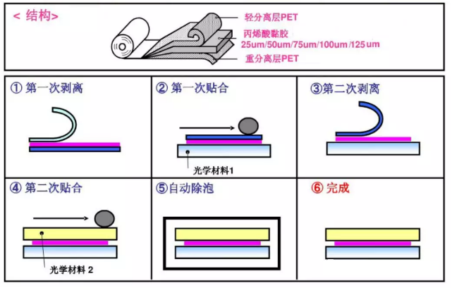OCA(Optically Clear Adhesive)用于膠結(jié)透明光學(xué)元件(如鏡頭等)的特種粘膠劑。要求具有無(wú)色透明、光透過(guò)率在90%以上、膠結(jié)強(qiáng)度良好,可在室溫或中溫下固化,且有固化收縮小等特點(diǎn)。